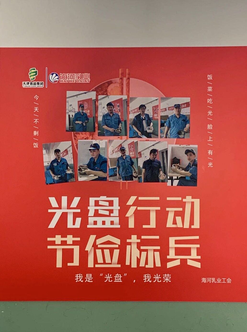 海河乳業公司工會向全體職工發出“厲行節約、反對浪費”倡議書,從我做起、從當下做起,積極踐行“光盤行動”,共同營造浪費可恥、節約光榮的活動氛圍。在公司廠區和食堂張貼宣傳標語,在食堂用投影儀播放相關視頻,利用電子屏滾動播放宣傳口號,積極營造宣傳氛圍,引導職工樹立“節約光榮、浪費可恥”的價值觀,倡導節儉文明的生活方式。